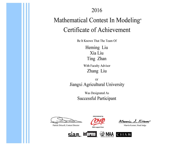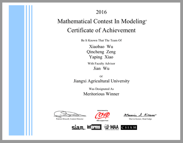 日前,我校学子参加美国大学生数学建模竞赛,喜获一等奖1项,三等奖1项。由伍健老师指导的吴晓宝、肖娅萍和曾钦城等3名同学组成的团队获得国际一等奖;由刘章老师指导的刘禾铭、詹婷、刘夏团队获得国际三等奖。